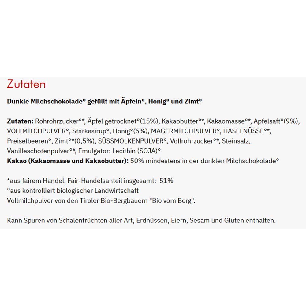 Zimt Apfel+ Honig, 70 g, bio°, in 50 % dunkler Bergmilchschokolade